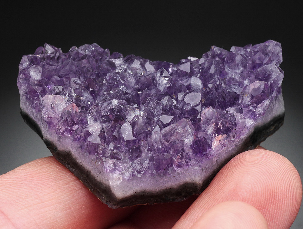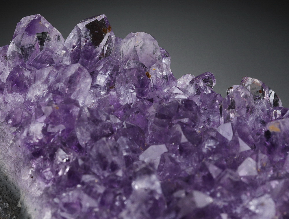 Błyszcząca szczotka dobrze wybarwionych kryształów ametystu.