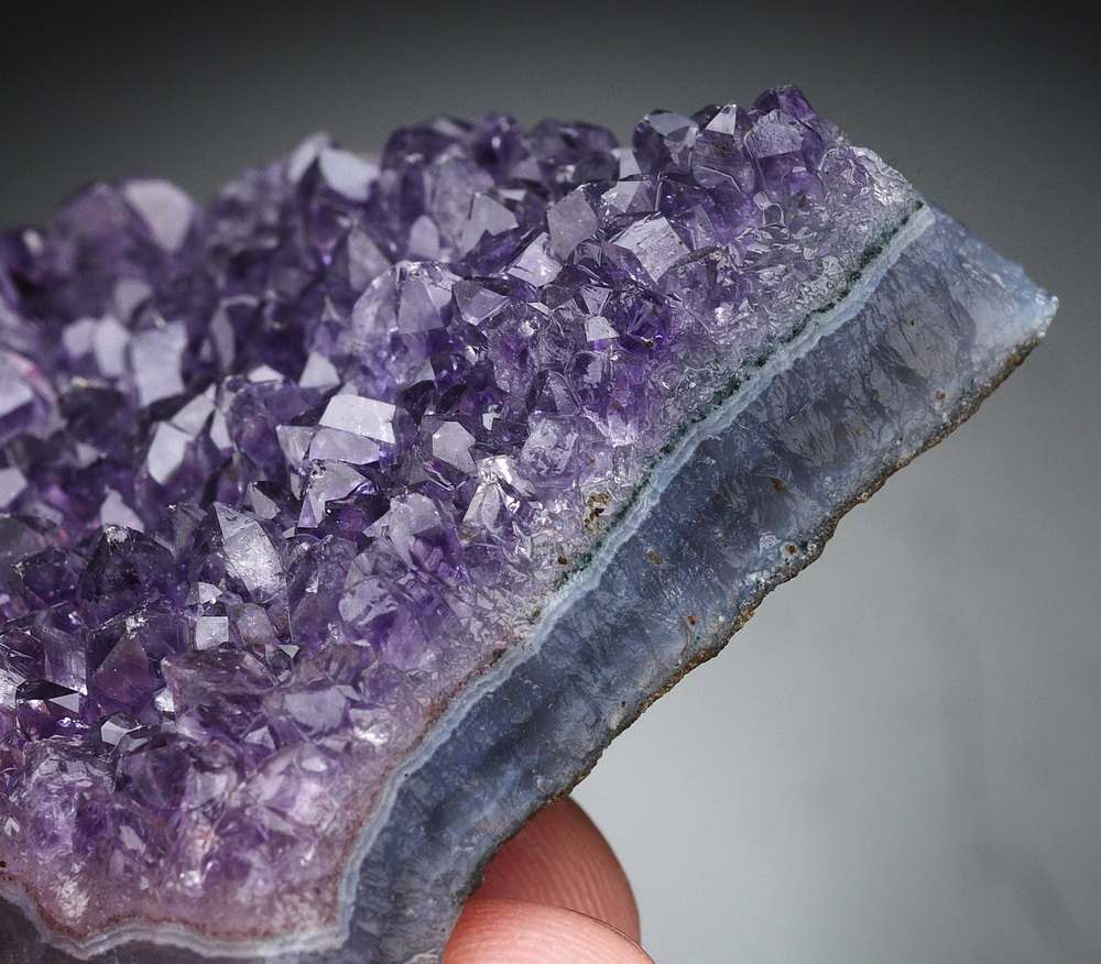 Błyszcząca szczotka dobrze wybarwionych kryształów ametystu.