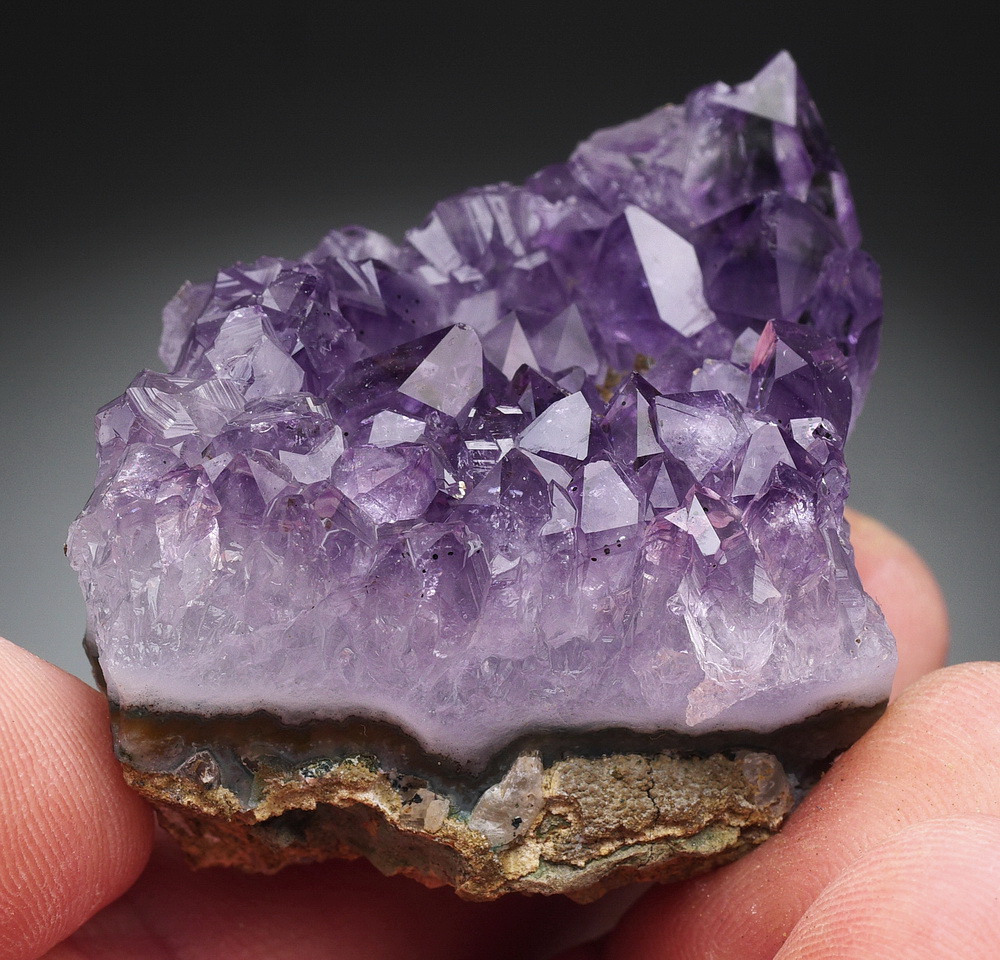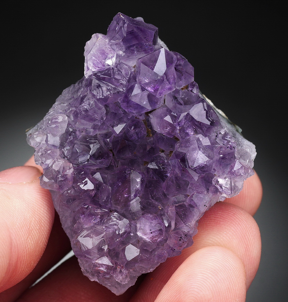 Błyszcząca szczotka dobrze wybarwionych kryształów ametystu.