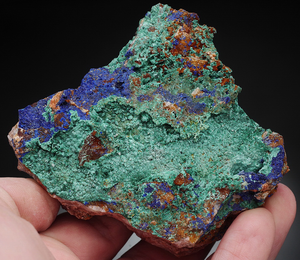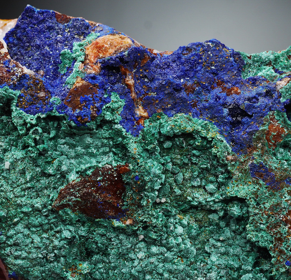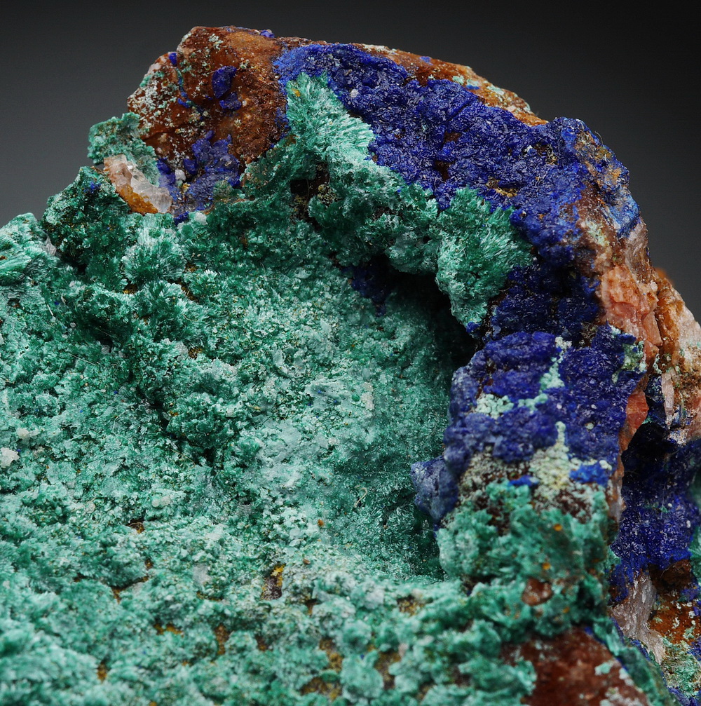 Skupienia intensywnie niebieskiego azurytu (połyskująca druza)  z zielonym malachitem na matrixie.