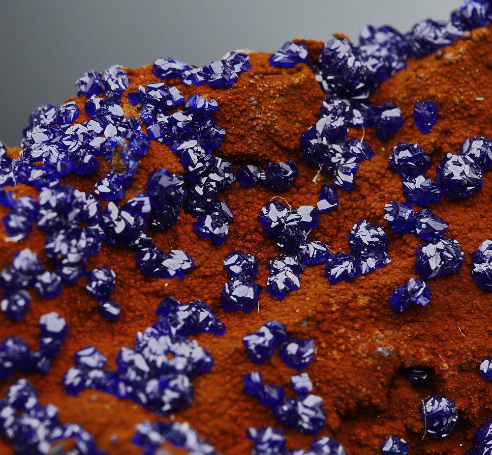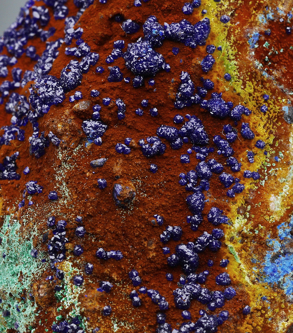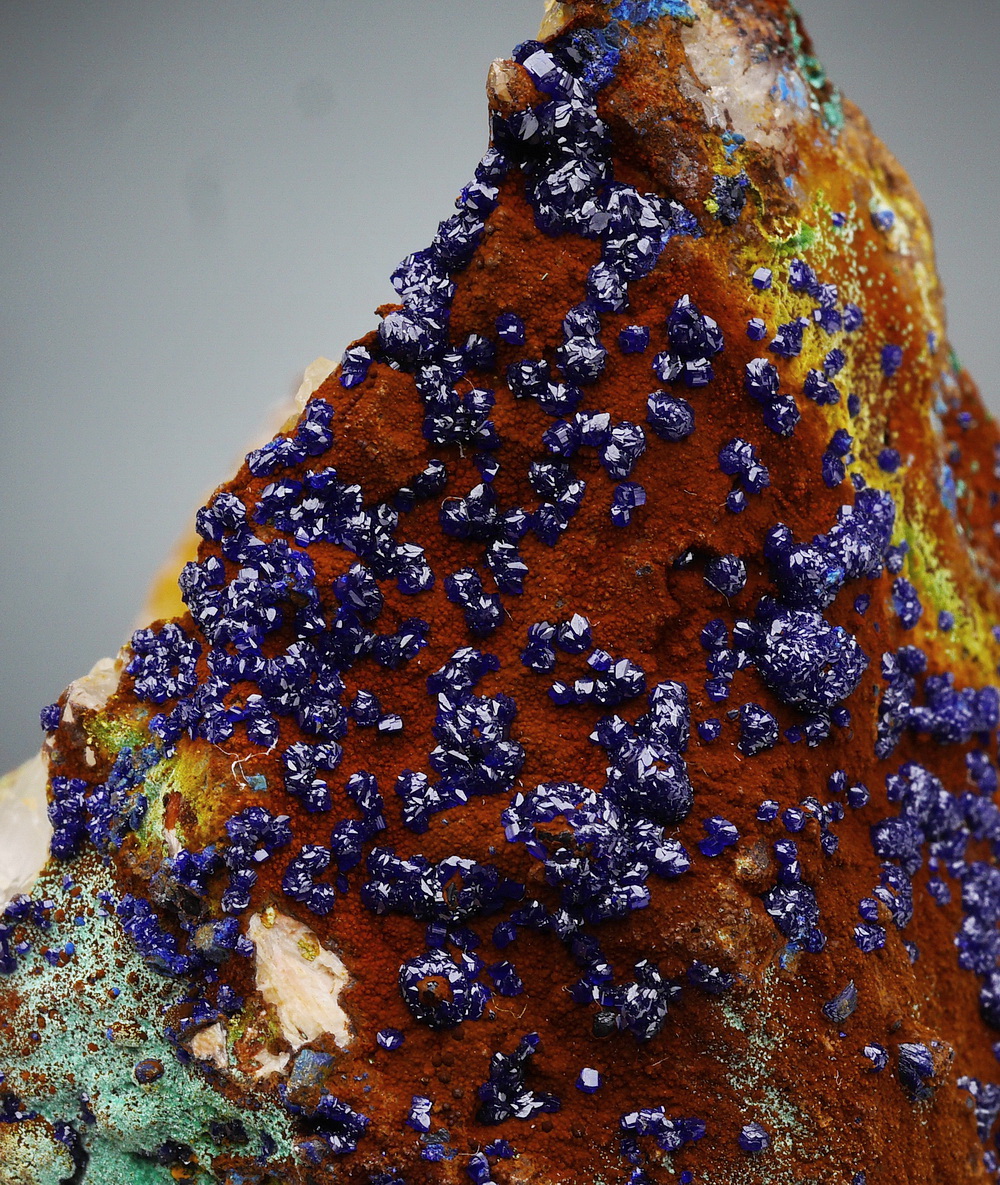 Skupienia intensywnie niebieskiego azurytu (połyskująca druza)  z zielonym malachitem na matrixie.