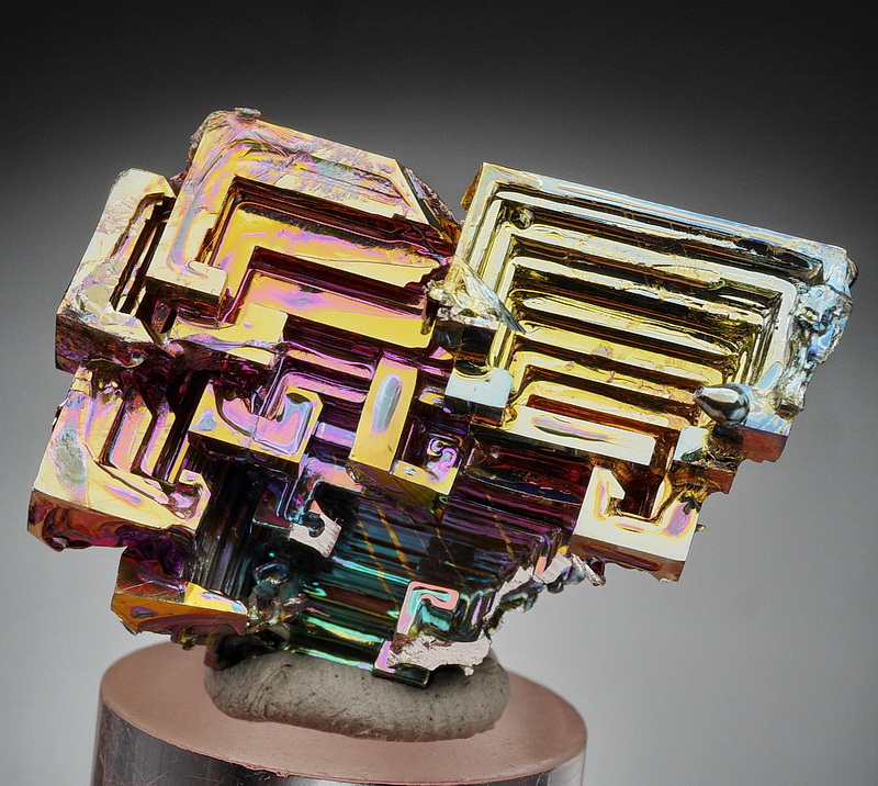 Szkieletowe kryształy bizmutu o silnym metalicznym połysku i tęczowych barwach. Minerał hodowlany.