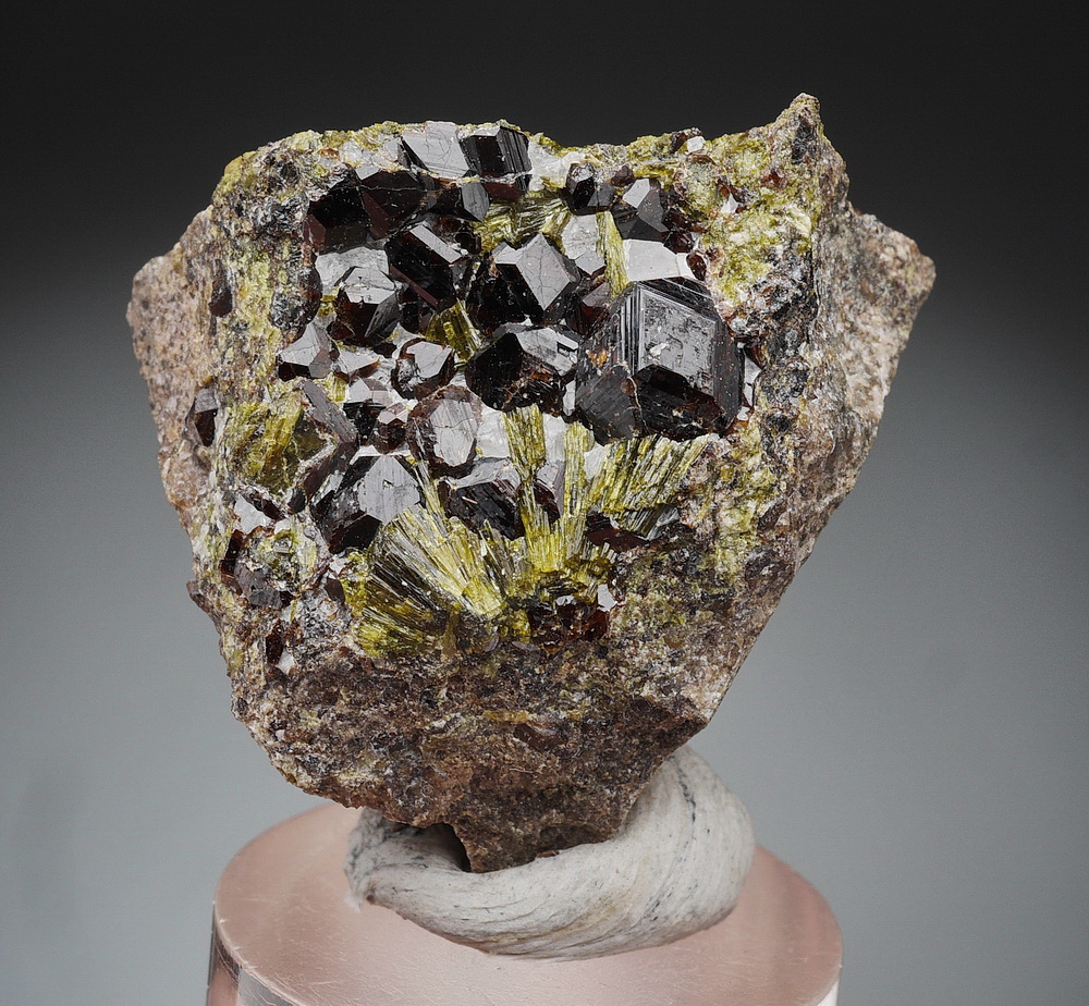 Estetyczny okaz dobrze wykształconych, bardzo błyszczących kryształów granatu z epidotem na matrixie.