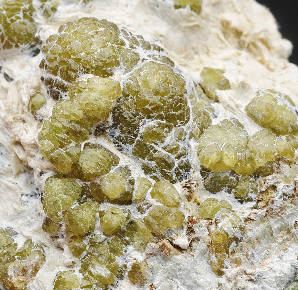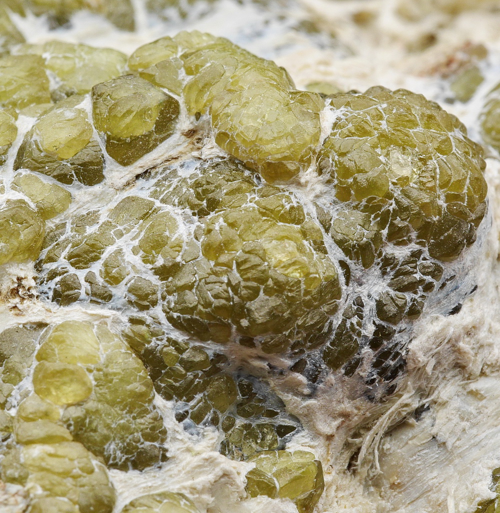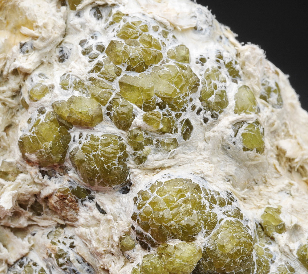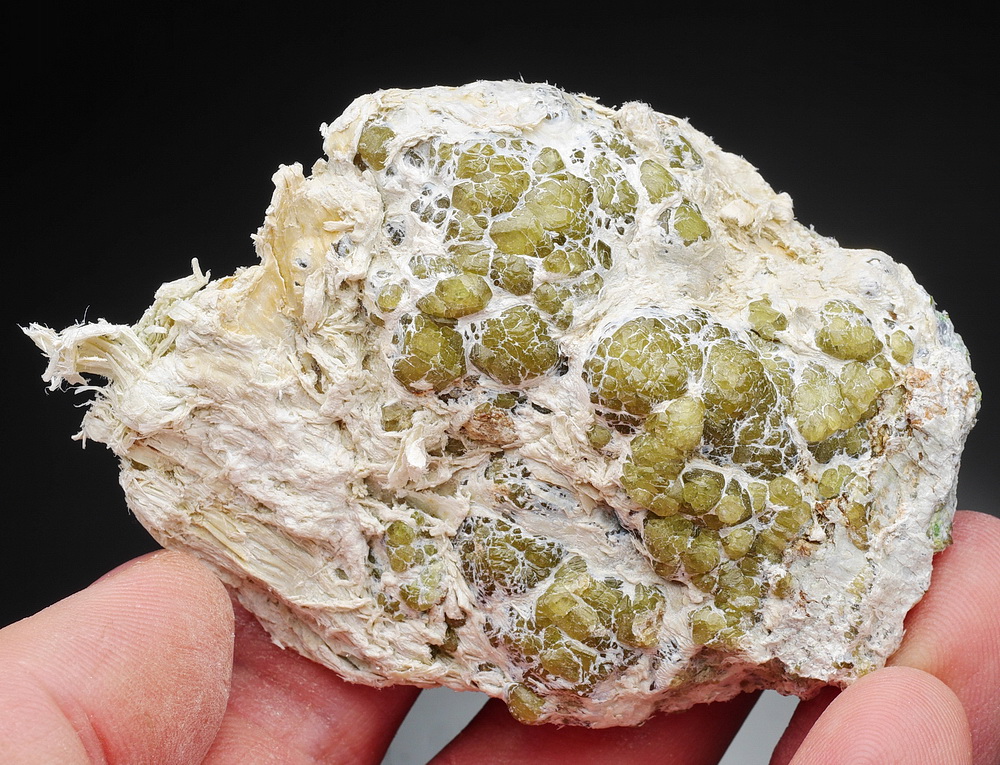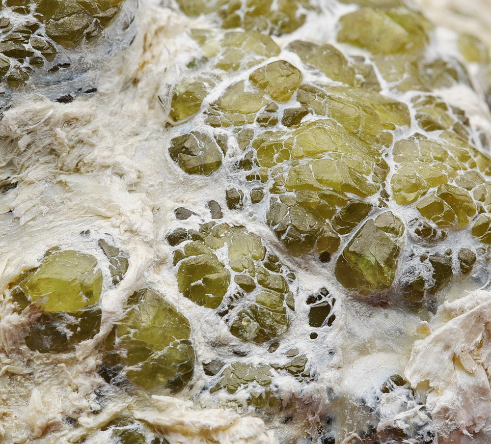 Skupienia błyszczących kryształów rzadkiego granatu - demantoidu osadzonego w białym azbeście - okaz z klasycznej lokalizacji. Okaz pochodzi ze starych zbiorów.
