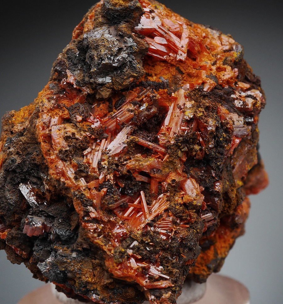 Bardzo błyszczące kryształy czerwonego krokoitu na limonicie.