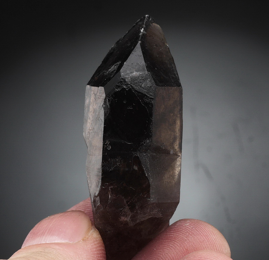 Błyszczący, dobrze wykształcony kryształ ptego kwarcu dymnego.