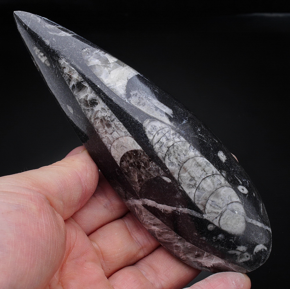 Polerowany okaz muszli / fragmokonu łodzika Orthoceras.
