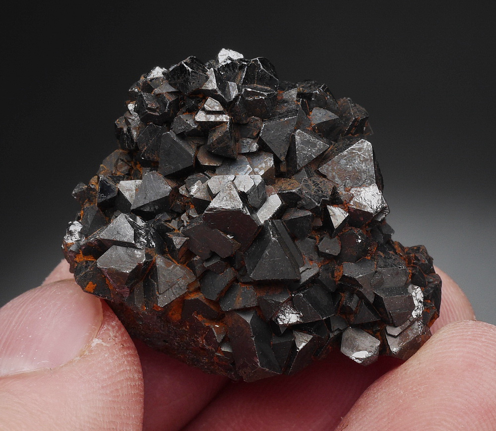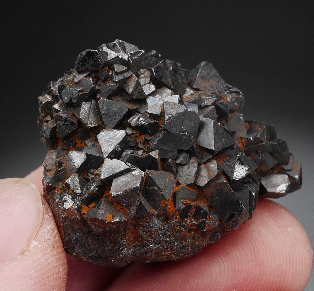 Błyszczący zrost dobrze wykształconych kryształów (ośmiościany) magnetytu - minerału o właściwościach magnetycznych - okaz przyciąga magnes.