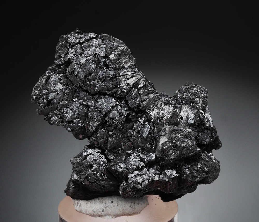 Błyszczący zrost kryształów rzadkiego ramsdellitu.