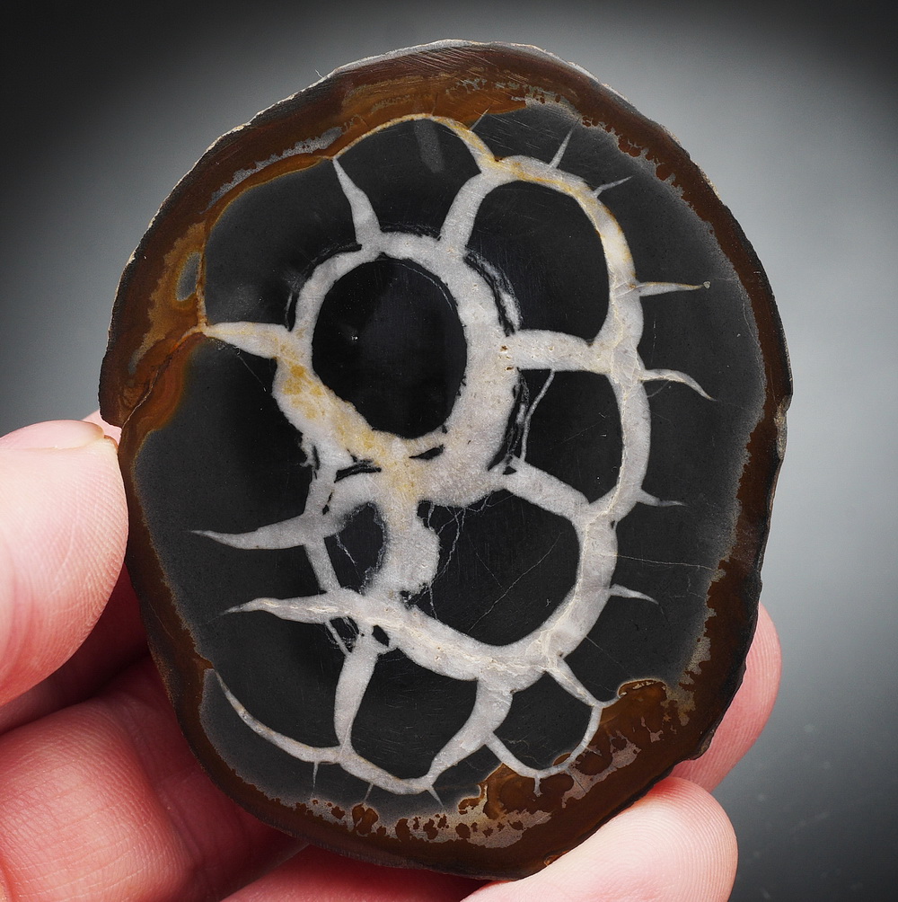 Polerowana połowka septari ilasto-żelazistej z szczelinami kalcytowymi w fantastycznym kształcie.