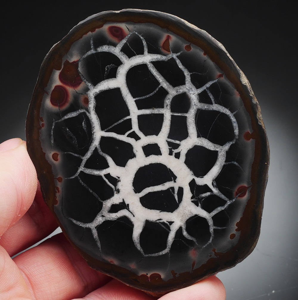Polerowana połowka septari ilasto-żelazistej z szczelinami kalcytowymi w fantastycznym kształcie.