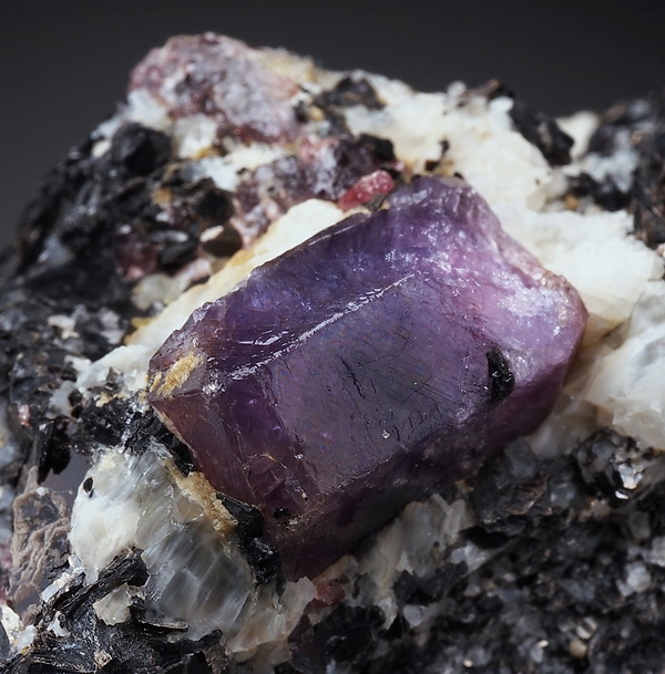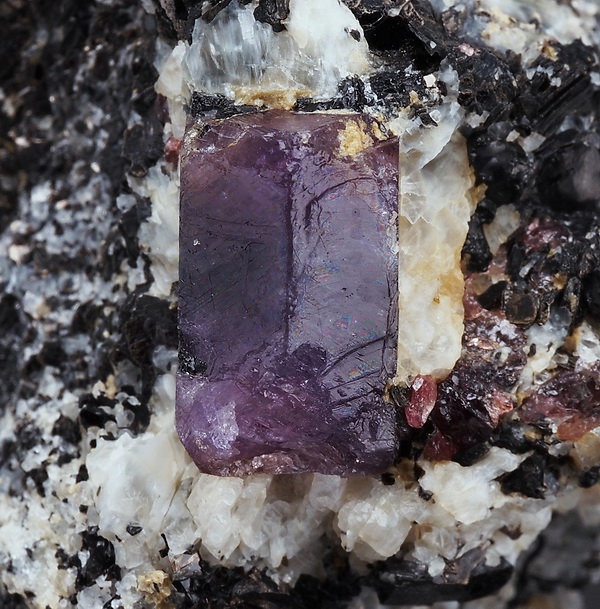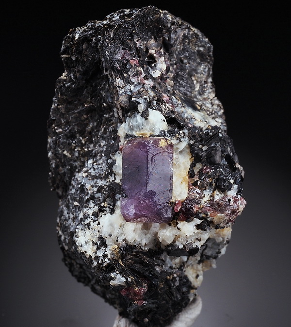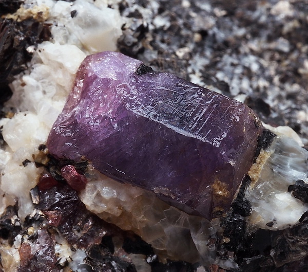 Kryształ szafiru (odmiana korundu) w matrixie (biotyt, skaleń).
