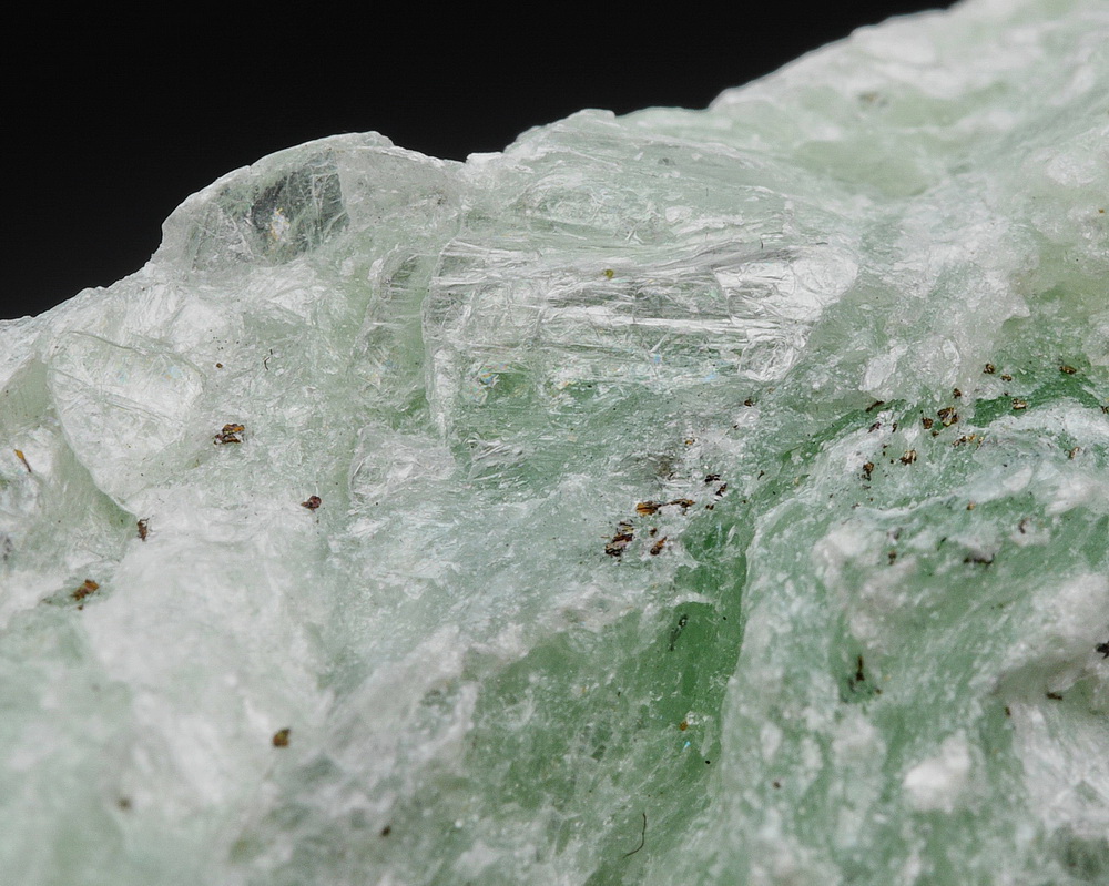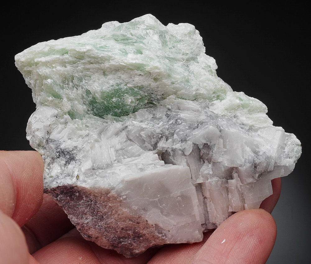 Blaszkowe, błyszczące skupienia talku z kalcytem z rzadkiej lokalizacji. Talk to najmiększy minerał na świecie - wzorcowy o twardości 1 w skali Mohsa